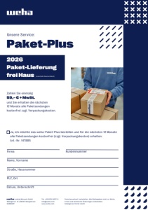 Ludwig Werwein GmbH Wikingerstr. 15 | 86343 Königsbrunn GERMANY Straße, Hausnummer Datum, Unterschrift Firma Kundennummer Name, Vorname PLZ, Ort Zahlen Sie einmalig 59,– €+MwSt. und Sie erhalten die nächsten 12 Monate alle Paketsendungen kostenfrei zzgl. Verpackungskosten. Ja, ich möchte das weha-Paket-Plus bestellen und für die nächsten 12 Monate alle Paketsendungen kostenfrei (zzgl. Verpackungskosten) erhalten. Art.-Nr. 147885 Unsere Service: Paket-Plus 2026 Paket-Lieferung frei Haus Tel. +49 8231 6007-0 info@weha.com www.weha.com Zwischenverkauf vorbehalten. Alle Maßangaben sind ca.-Werte. Irrtum und technische Änderungen vorbehalten. Solange der Vorrat reicht. (innerhalb Deutschland)