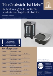 #145656 Laterne No° 1484 Höhe: 17,5 cm MS-BZton #145657 Laterne No° 1484 Höhe: 17,5 cm Aluminium #145661 Laterne No° 1485 Höhe: 22,5 cm MS-BZton #145662 Laterne No° 1485 Höhe: 22,5 cm Aluminium #145659 Weihkessel No° 184 Breite: 11 cm x Tiefe: 11 cm MS-BZton #145660 Weihkessel No° 184 Breite: 11 cm x Tiefe: 11 cm Aluminium Die besten Angebote nur für Sie - exklusiv zum Tag des Grabsteins gültig vom 16.10. bis 31.12.2025 Alle Preise zzgl. ges. MwSt. Lieferung ab Werk. Innerhalb Deutschlands: ab € 350,– (Paketdienst) frei Haus. Bestellungen via Shop frei Haus ausgenommen Verpackungskosten. Alle Maßangaben sind ca. Werte. Irrtum und technische Änderungen vorbehalten. Gültig solange der Vorrat reicht. Sonderpreise Beim Kauf von 10 Produkten aus dieser Aktion erhalten Sie zusätzlich 10 % Sonderrabatt! “Ein Grabstein ist Liebe” Folge uns und verpasse keine Neuigkeiten! info@weha.com www.weha.com Kontaktieren Sie Ihren zuständigen Außendienst oder den Verkauf Innendienst +49 8231 6007 - 179 vertrieb@weha.com Jetzt beraten lassen oder direkt bestellen!